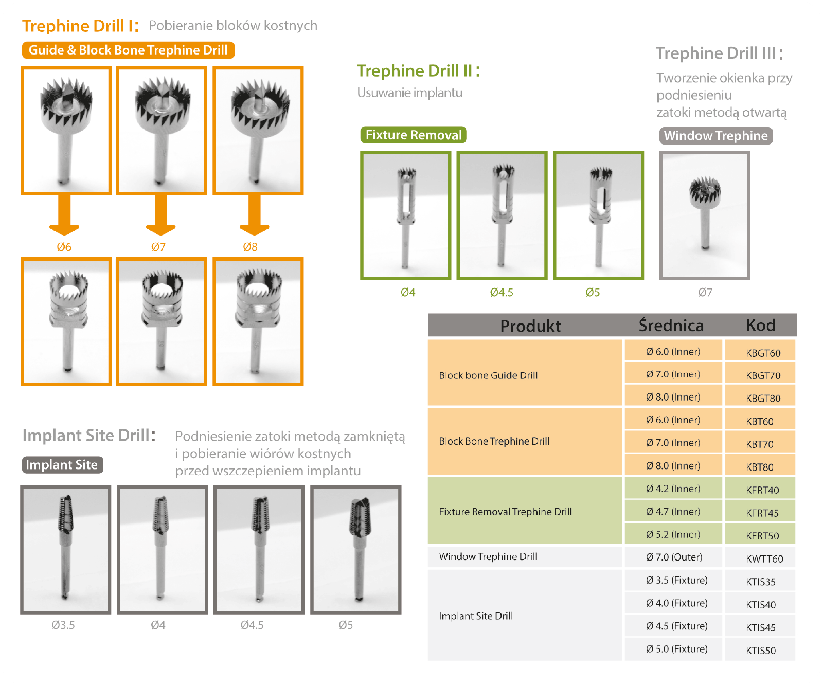 Łatwy w użyciu zestaw zawierający wiertła do pobierania bloków, kości, usuwania implantu wraz z kością.